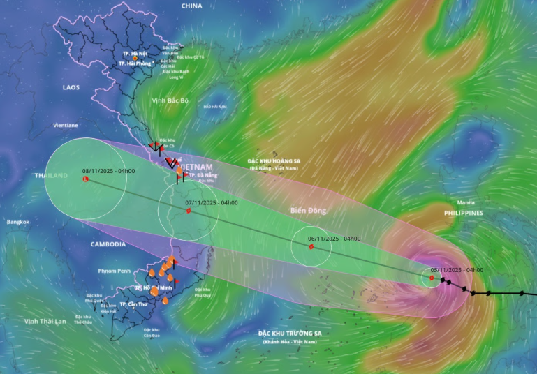 Vừa vào Biển Đông vào sáng sớm 5/11 với sức gió cấp 13, giật cấp 16, bão Kalmaegi di chuyển với tốc độ "phi mã" 25km/h.