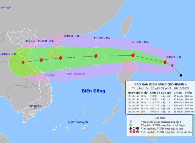 Bão KOMPASU có khả năng đi vào phía Bắc Biển Đông trong những ngày tới. Dự báo, đến 19 giờ ngày 12/10, vị trí tâm bão ở khoảng 19,0 độ Vĩ Bắc; 116,2 độ Kinh Đông, cách quần đảo Hoàng Sa khoảng 600km về phía Đông Đông Bắc. Sức gió mạnh nhất vùng gần tâm bão mạnh cấp 11 (100-120km/giờ), giật cấp 13.