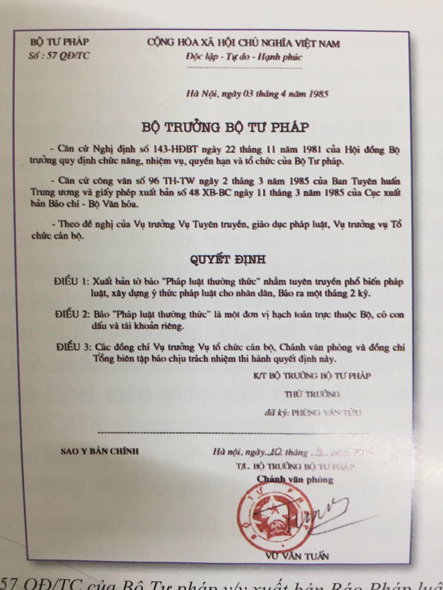 Ông chia sẻ, năm 1981, sau một thời gian dài mang tên Ủy ban Pháp chế Chính phủ, Bộ Tư pháp được thành lập lại. Bốn năm sau, ngày 03/4/1985, Bộ trưởng Bộ Tư pháp đã ký Quyết định số 57/QĐTC về việc xuất bản tờ báo Pháp luật thường thức nhằm tuyên truyền, phổ biến pháp luật, xây dựng ý thức pháp luật cho Nhân dân. Báo xuất bản một tháng 2 kỳ. Nguyên Bộ trưởng Bộ Tư pháp Phan Hiền ngày đó mong muốn có tờ báo tuyên truyền pháp luật bằng cách viết hết sức đơn giản, dễ hiểu, không phức tạp, hàn lâm, để những quy định của pháp luật trở nên gần gũi, dân dễ biết và chấp hành nghiêm chỉnh.