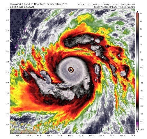 Cụ thể, siêu bão Sinlaku tăng cường độ rất nhanh, đạt sức gió duy trì khoảng 289 km/h, giật lên tới 354 km/h, chính thức trở thành cơn bão mạnh nhất hành tinh trong năm 2026 tính đến thời điểm hiện tại.