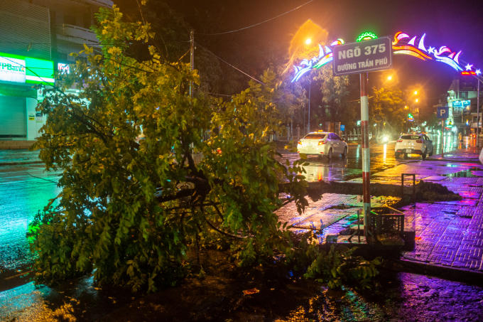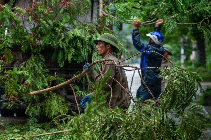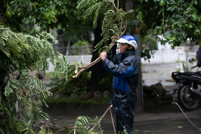 Trong đất liền, công nhân công ty môi trường Cẩm Phả được điều động túc trực chặt tỉa các cành cây lớn để tránh đổ ngã gây thiệt hại cho người và tài sản.