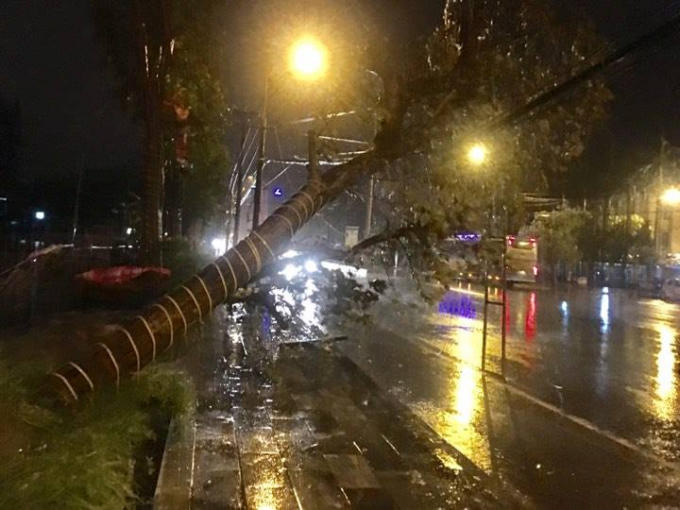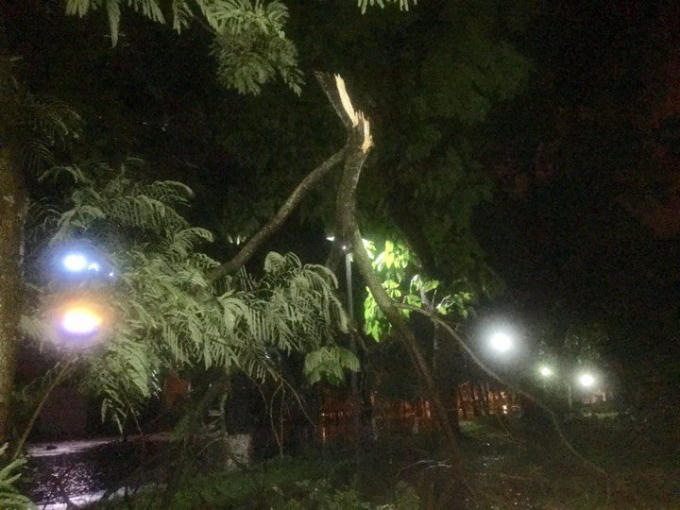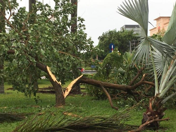 Tại TP Vinh (Nghệ An) một số cây xanh bị gió giật gẫy. Có cây ở bến xe Vinh gió giật bật gốc..
