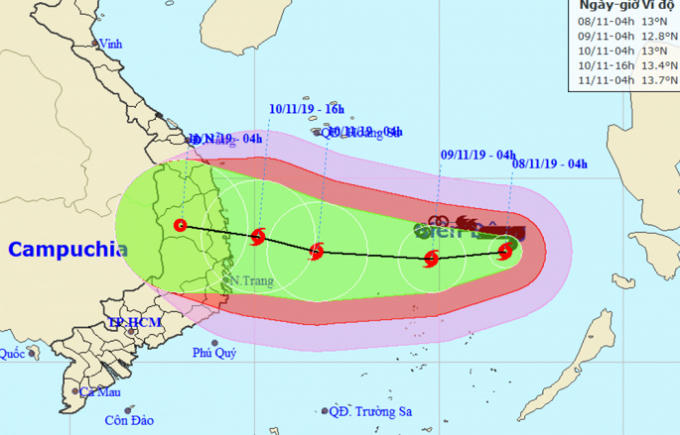 Dự báo trong 24 giờ tới, bão đổi hướng di chuyển về phía Tây, mỗi giờ đi được 5-10km và có khả năng mạnh thêm. Đến 4h ngày 9/11, tâm bão cách đảo Song Tử Tây khoảng 170km về phía Bắc. Sức gió mạnh nhất vùng gần tâm bão mạnh cấp 12 (115-135km/giờ), giật cấp 15.