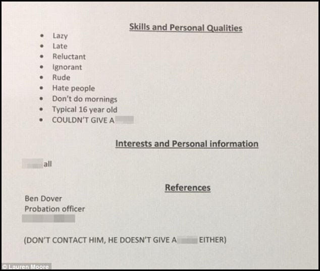 Khi viết CV xin việc, người ta thường hay cố gắng làm sao để khiến mình nổi bật đầy ấn tượng, nhưng cha của Lauren lại có cách tiếp cận khác, ông viết về những kỹ năng của con gái mình là: “lười biếng, không đúng giờ, khó bảo, chậm hiểu, thô lỗ, hay khó chịu, thường lờ đờ buổi sáng, đúng kiểu một thiếu niên 16 tuổi, chẳng buồn quan tâm tới chuyện gì”.