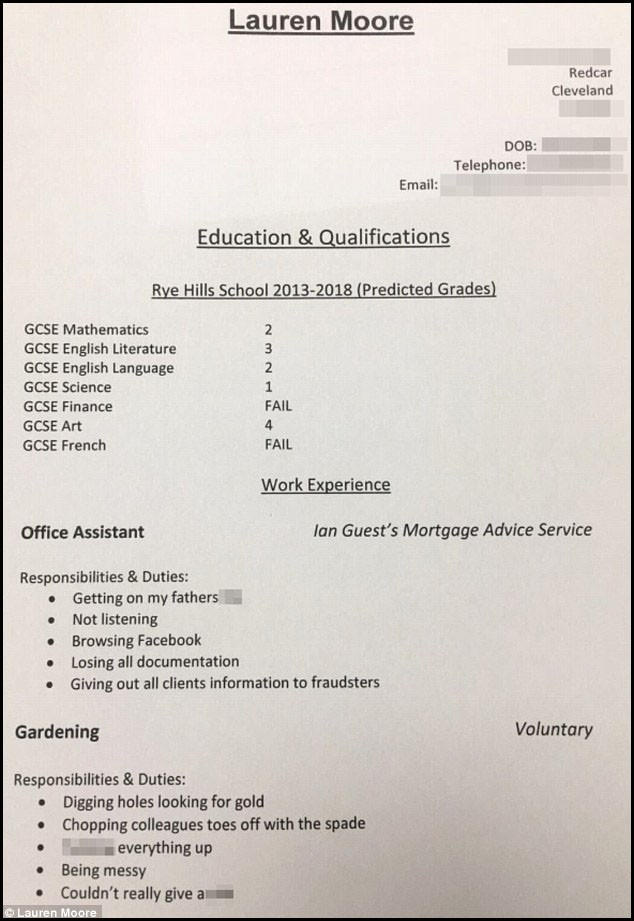 Cũng cùng câu chuyện về CV, nhưng cha của cô gái có tên Lauren Moore sống ở hạt North Yorkshire, Anh, lại có cách tiếp cận hài hước đến khó tin. Khi được con gái nhờ viết giúp CV xin việc, cha của Lauren đã thực hiện một bản CV trung thực đến mức gây sững sờ “giúp” cô con gái 16 tuổi.