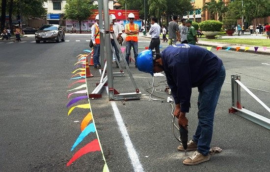 Theo ghi nhận của PV VietNamNet, trên tuyến đường Công Xã Paris đoạn qua trước tòa bưu điện TP, nhà thầu thực hiện việc kẻ vạch để khoan cắt mặt đường, lắp đặt rào chắn.