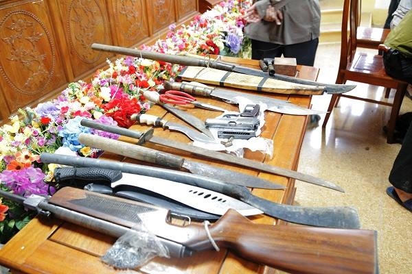 Ngoài ra, cơ quan chức năng còn thu 1 khẩu súng ngắn quân dụng k59 với 3 viên đạn đã lên nòng, 1 khẩu súng hơi, 10 dao kiếm các loại, 1 bộ mặt nạ phòng hơi độc.