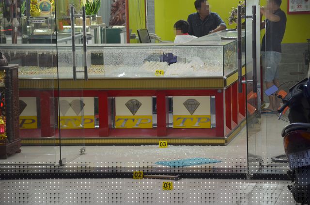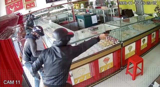 Tại đây, một đối tượng cầm súng xông vào nổ 2 phát đe doạ chủ tiệm vàng, đối tượng còn lại cầm búa đập vỡ tủ kính lấy đi một số vàng. Sau đó, cả hai nhảy lên xe tẩu thoát về hướng quốc lộ 22.