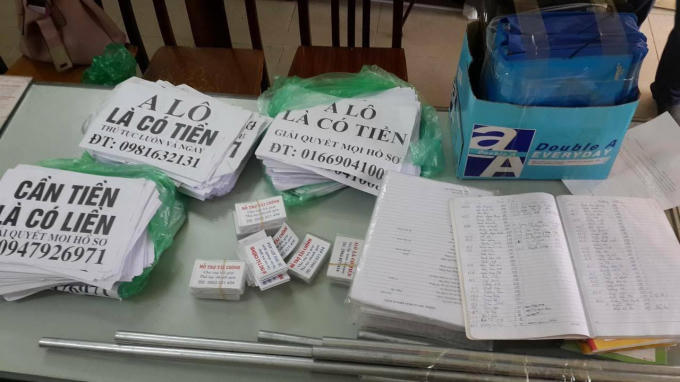 Quá trình kiểm tra đã thu giữ 8 ống tuýp kim loại, 162 bộ hồ sơ vay tiền, 6 chiếc xe máy các loại, 10 kg tờ rơi quảng cáo với nội dung cho vay tiền, khoảng 400 chiếc card visit giới thiệu cho vay tiền.