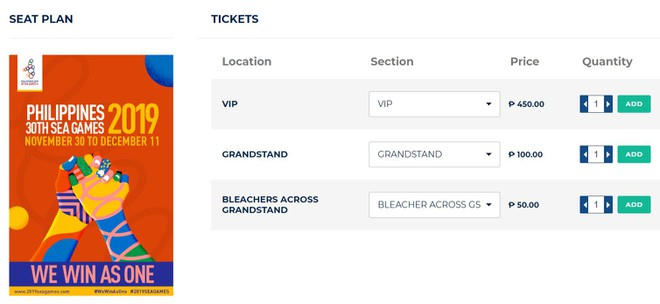 Trên trang chủ SEA Games 2019 đưa thông báo về mức vé của các môn thi đấu được chủ nhà Philippines phát hành. Vé rẻ nhất chỉ khoảng 22.000 đồng/vé.