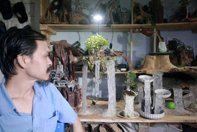 “Đảo bay” là tác phẩm lớn đầu tiên anh Huỳnh làm cho một khách đặt. Tác phẩm cao khoảng 40cm nên làm rất kỳ công, thời gian làm 5 ngày mới xong. Bình thường tiểu cảnh nhỏ chỉ cần đổ một thác nước là chịu lực được nhưng “đảo bay” có đá nặng nên cần 2 thác nước bằng keo