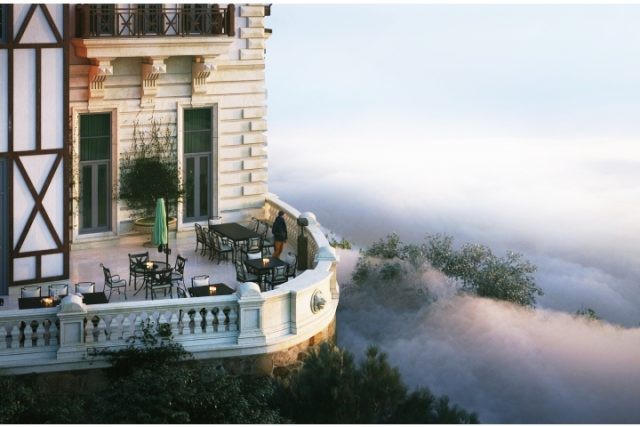 Tòa lâu đài nằm trên đỉnh núi, giữa không gian mây xanh bồng bềnh, cùng với những ngọn núi xanh xanh phía xa.