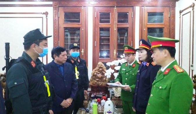 Cơ quan chức năng đọc Quyết định khởi tố bị can, Lệnh bắt bị can để tạm giam, Lệnh khám xét đối với ông Trương Minh Hiến (Ảnh: Công an Hà Nam).