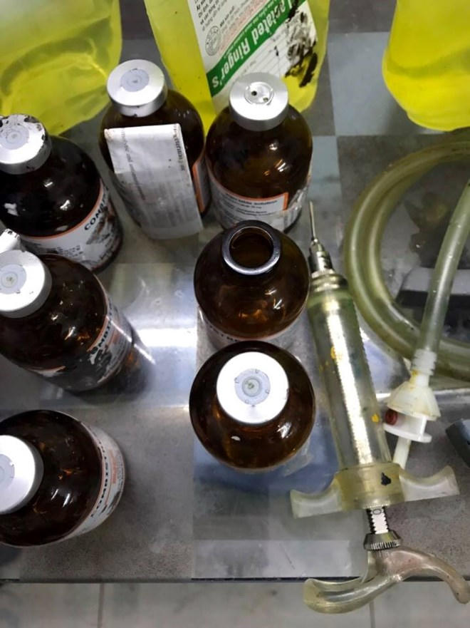 “Tại hiện trường, lợn được tiêm thuốc an thần nằm la liệt. Các cơ quan chức năng đã phát hiện nhiều vỏ lọ thuốc, dung dịch màu vàng được đựng trong chai truyền nước (ghi dung dịch thuốc an thần) và các dụng cụ dùng để tiêm thuốc an thần cho lợn”- ông Phạm Tiến Dũng, Trưởng phòng Thanh tra chuyên ngành, Thanh tra Bộ NN&PTNT cho hay.