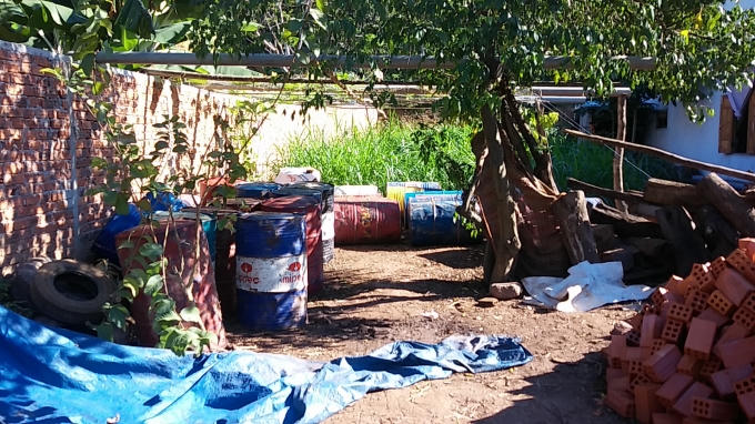 Trên bãi đất trống cạnh nhà Thảo, Phòng PC46 phát hiện 28 thùng phuy chứa hơn 5.000 lít xăng dầu nhưng vợ chồng Thảo phủ nhận số xăng dầu này của mình.