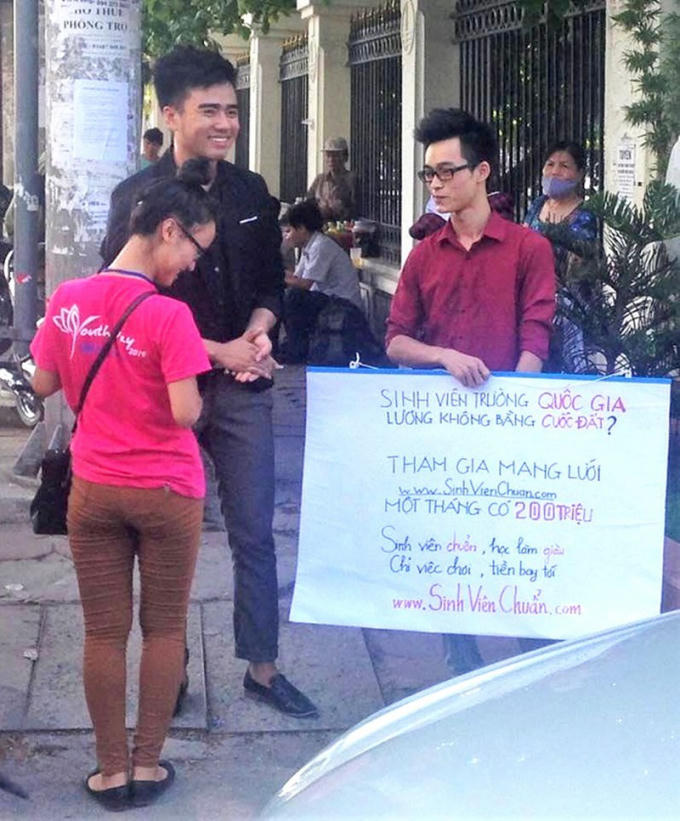Có thể thấy, chiêu bài của các công ty đa cấp hướng đến các em sinh viên rất lắt léo, đa dạng. Ban đầu, để dụ dỗ các em, các công ty này thường thông qua những “bên thứ 3”, người quen biết hoặc “con mồi cũ”. Nhiều công ty còn công khai đăng những mẩu quảng cáo đầy hấp dẫn như “cần sinh viên làm thêm, lương cao, ưu đãi tốt, có khả năng thăng tiến” đánh vào tâm lý mong mỏi có việc làm thêm của các em.