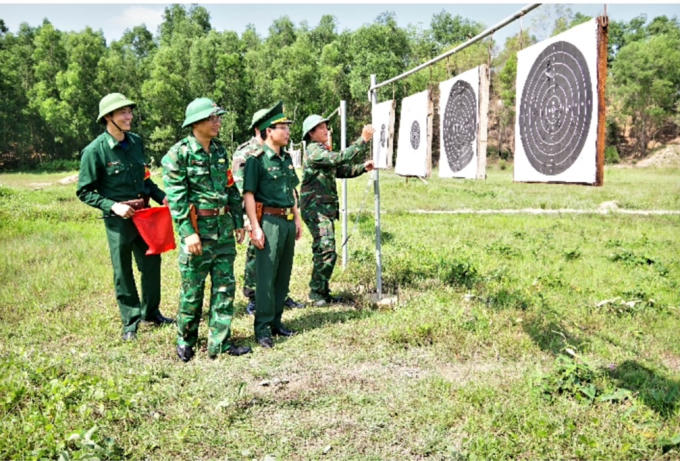 Đại tá Vũ Quốc Ân, Bí thư Đảng uỷ, Chính uỷ BĐBP TP.HCM tham quan và động viên cán bộ, chiến sỹ tham gia kiểm tra bắn đạn thật súng k54 bài 1b, 1c. (Ảnh: L.Kiểm - Đ.Chiến)