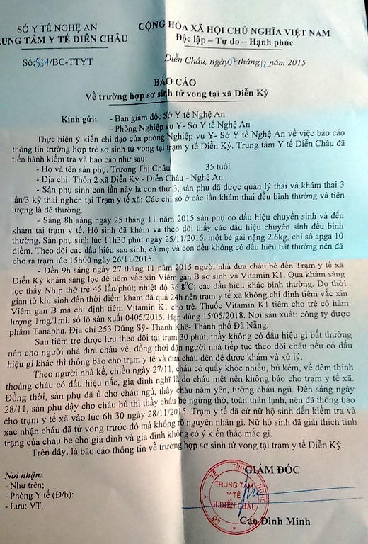 Cũng theo báo cáo này, thì Vitamin K1 tiêm cho bé con chị Châu có hàm lượng 1mg/1ml, số lô sản xuất 0405/2015. Hạn dùng 15/5/2018. Nơi sản xuất, công ty dược phẩm Tanapha (ở 253 Dũng Sỹ, Thanh Khê, Đà Nẵng).