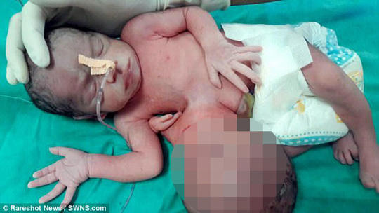 Một bé gái người Ấn Độ vừa ra đời với một chiếc đầu thứ hai và một bàn tay thứ ba mọc ở ngay vùng bụng, thông với dạ dày.