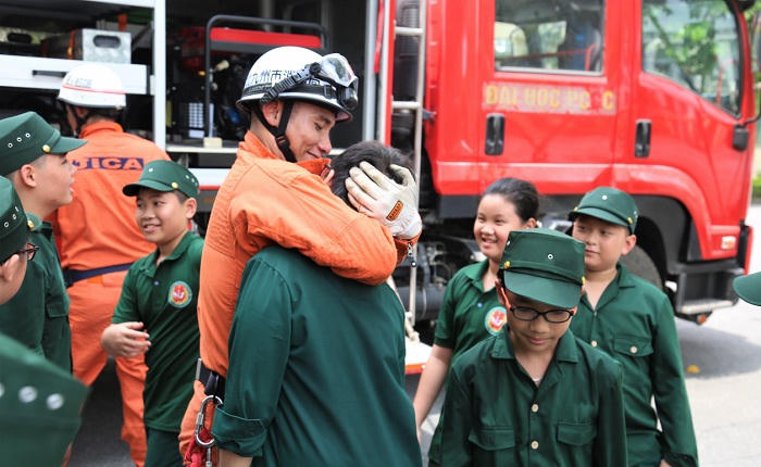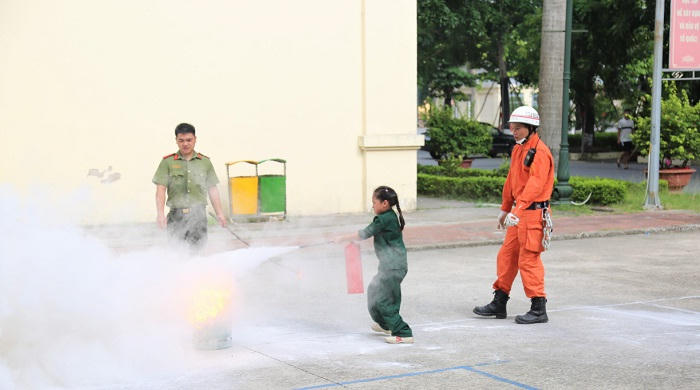 Nhà trường cũng đã phối hợp với Trường Đại học Phòng cháy chữa cháy Bộ Công an tổ chức hướng dẫn các cháu thực hành một số kỹ năng như: Kỹ năng phòng chống cháy nổ và kỹ năng ứng phó với các tình huống khẩn cấp.
