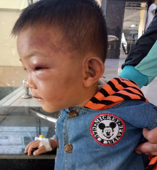 Khuôn mặt sưng phù, không thể ăn được, bé trai sau đó được đưa đến bệnh viện điều trị. Theo người thân thì bé bị cha dượng đánh đập.