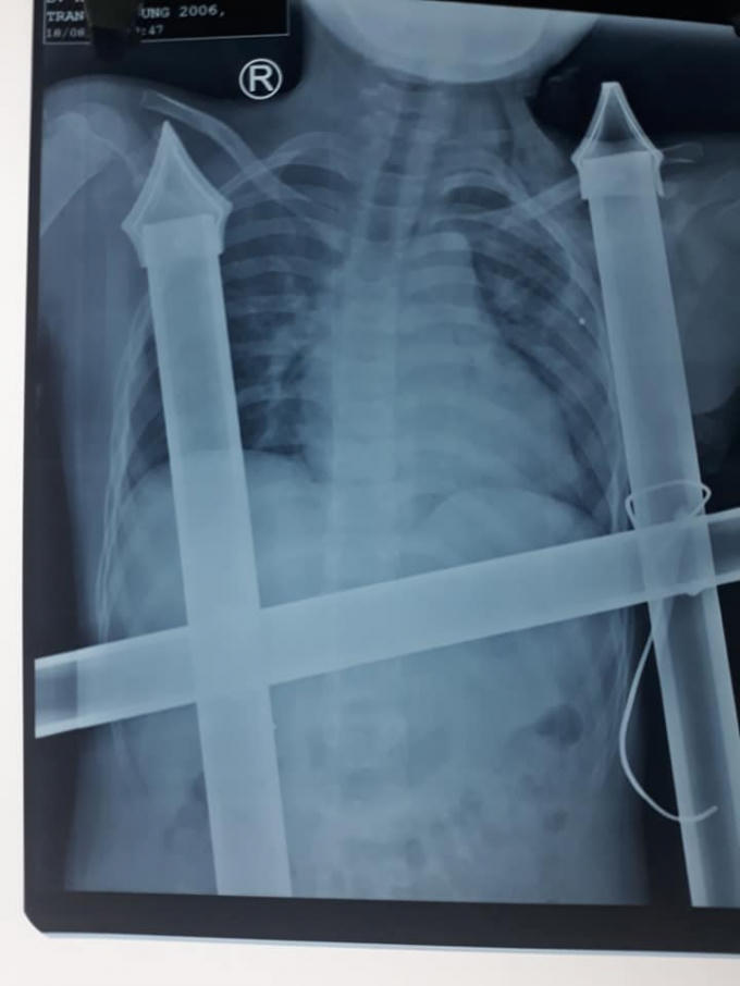 Hình ảnh chụp Xquang cho thấy thanh kim loại xuyên sâu vào ngực bé trai.