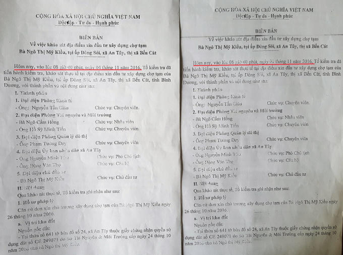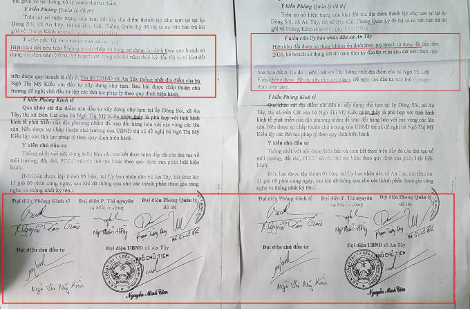 Để chứng minh, bà T. cung cấp cho phóng viên 2 Biên bản (về việc khảo sát địa điểm xin đầu tư xây dựng chợ tạm Dòng Sỏi) khác nhau về ngày, tháng lập nhưng nội dung và hình thức trình bày rất giống nhau. Điều đặc biệt của hai văn bản này nằm ở chỗ, tại phần ý kiến của ông Tâm, Phó Chủ tịch UBND xã An Tây lại khác nhau đến bất ngờ.