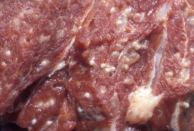Thông thường, sau 24-72 giờ kể từ khi ăn phải ấu trùng, ấu trùng sẽ cư trú ở các mô liên kết hoặc các cơ, sau 2 tháng, ấu trùng tạo thành một nang có vỏ bọc ngoài (kích thước 17-20x7-10 mm), còn được gọi là gạo lợn, trong nang gạo lợn có dịch màu trắng, mẩu đầu sán với 4 giác và 2 vòng móc.