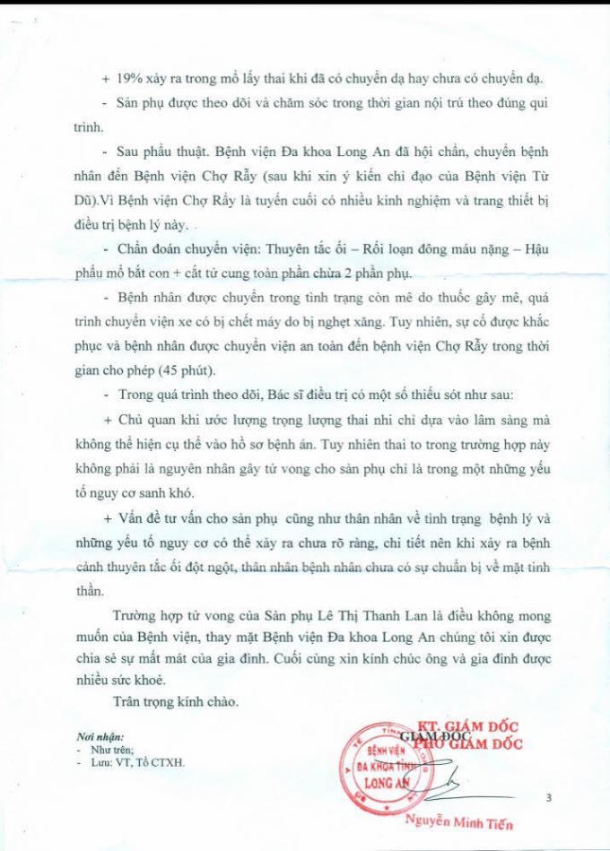 Thông tin vụ việc chị Lê Thị Thanh Lan (SN 1982, ấp Vườn Cò, xã Mỹ Lạc, huyện Thủ Thừa, Long An) tử vong sau khi sinh tại Bệnh viện Đa khoa Long An khiến dư luận đặc biệt quan tâm. Điều đáng nói, chồng sản phụ đã có đơn tố cáo Bệnh viện Đa khoa Long An làm việc tắc trách, dẫn đến cái chết của sản phụ.