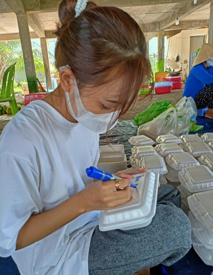 Một tình nguyện viên ghi chữ lên hộp cơm để động viên người trong khu cách ly.