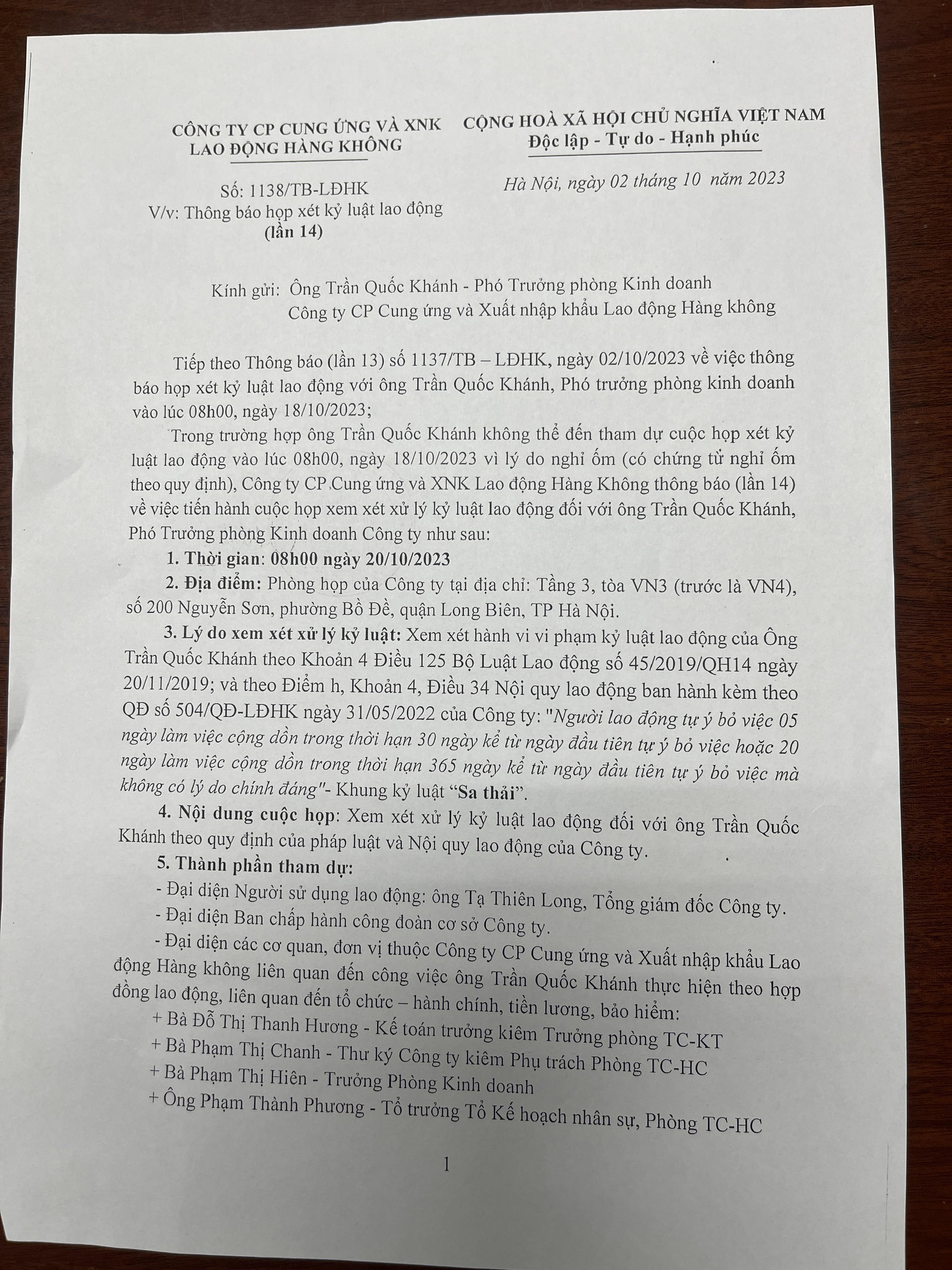 “Ngày 18/8/2023, ông Long ký quyết định số 912/QĐ-LĐHK, công văn số 913/TB-LĐHK và 914/TB-LĐHK về việc họp xem xét xử lý kỷ luật tôi với hình thức Sa thải và với lý do tôi bỏ việc quá 20 ngày làm việc cộng dồn trong thời hạn 365 ngày.