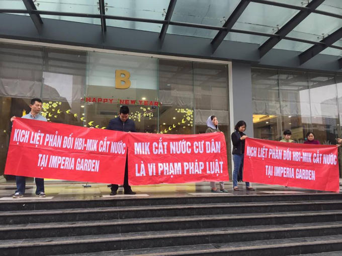 11 giờ trưa thứ 2 ngày 26/2/2018, PV có mặt tại khu chung cư Imperia Garden (203 Nguyễn Huy Tưởng, Hà Nội) PV nhận thấy nhiều băng rôn treo trên các căn hộ.