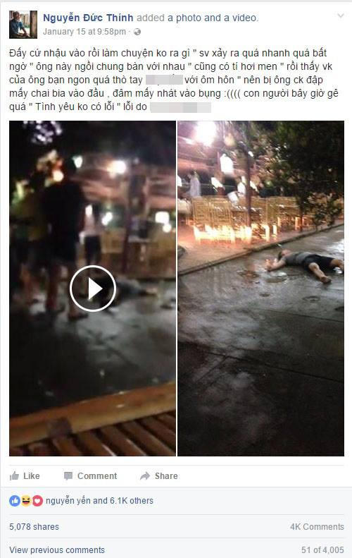 Ngay lập tức, người đàn ông đã lĩnh đủ sự giận dữ từ người chồng và nhóm bạn ngồi nhậu cùng với hàng loạt chai bia vào đầu và đâm nhiều nhát vào bụng.