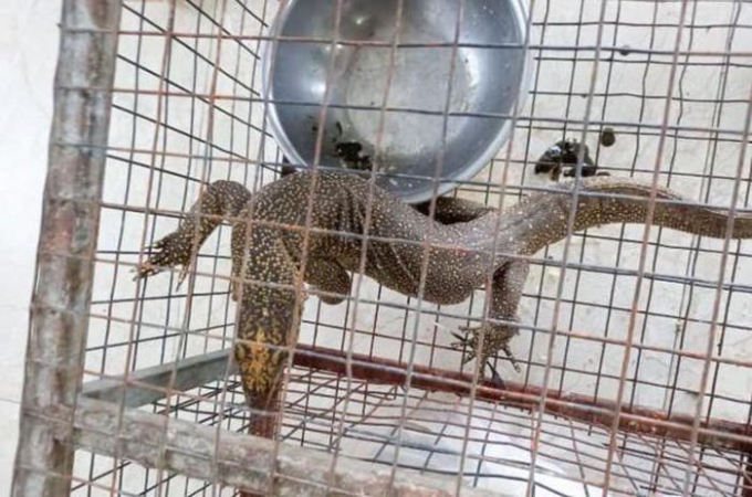 Tại khu vực nhà vệ sinh của nhà hàng có 1 cá thể kỳ đà vân đang còn sống (Varanus nebulosus, nhóm IB quý hiếm, nguy cấp) có trọng lượng 1,2 kg, bị thương ở chi trái trước, được nhốt trong lồng sắt nên tiến hành lập biên bản vi phạm để cứu hộ, chăm sóc cá thể động vật quý hiếm này.