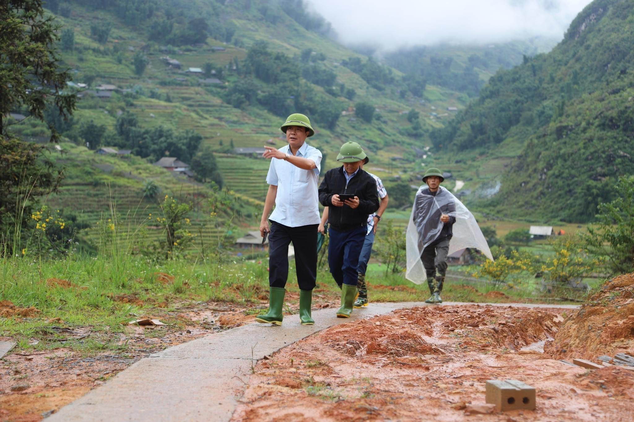 Ông Phan Đăng Toàn, Bí thư thị ủy Sa Pa cùng đoàn đi kiểm tra tại các điểm sạt lở.