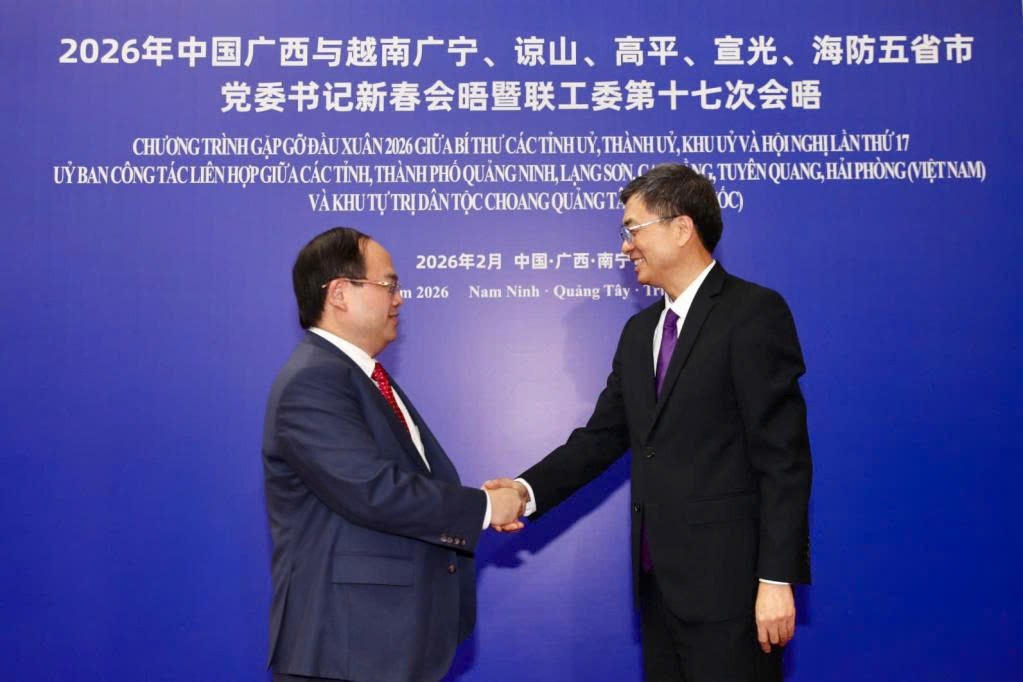 Trong khuôn khổ Chương trình Gặp gỡ đầu Xuân 2026 tại Khu tự trị Dân tộc Choang Quảng Tây (Trung Quốc), ngày 10/2, ông Quản Minh Cường, Ủy viên Trung ương Đảng Cộng sản Việt Nam, Bí thư Tỉnh ủy, Trưởng Đoàn đại biểu Quốc hội tỉnh Quảng Ninh đã có cuộc hội đàm với ông Trần Cương, Ủy viên Trung ương Đảng Cộng sản Trung Quốc, Bí thư Khu ủy, Chủ nhiệm Ủy ban Thường vụ Đại hội đại biểu nhân dân Khu tự trị Dân tộc Choang Quảng Tây. Tham dự hội đàm có lãnh đạo UBND tỉnh Quảng Ninh, các sở, ngành, địa phương liên quan.