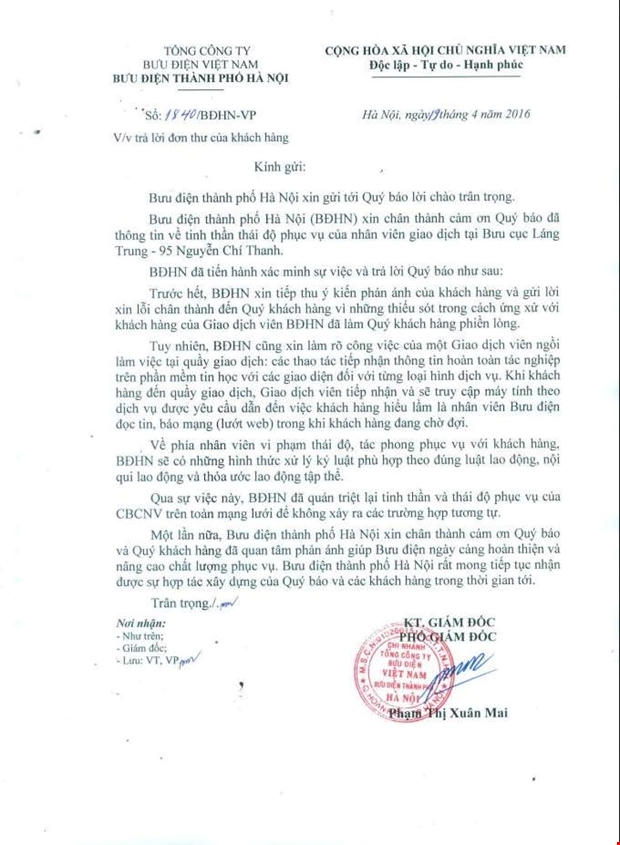 Theo đó, trong công văn phản hồi từ phía Bưu điện Hà Nội, bà Phạm Thị Xuân Mai- Phó Giám đốc chi nhánh Tổng công ty Bưu điện Việt Nam - Bưu điện thành phố Hà Nội cho biết: “Về phía nhân viên vi phạm thái độ, tác phong phục vụ với khách hàng, Bưu điện Hà Nội sẽ có những hình thức xử lý kỷ luật phù hợp đúng luật lao động, nội quy lao động và thỏa ước lao động tập thể”.