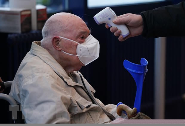 Kiểm tra thân nhiệt tại một trung tâm tiêm chủng ngừa COVID-19 ở Berlin, Đức. (Ảnh: AFP/TTXVN)