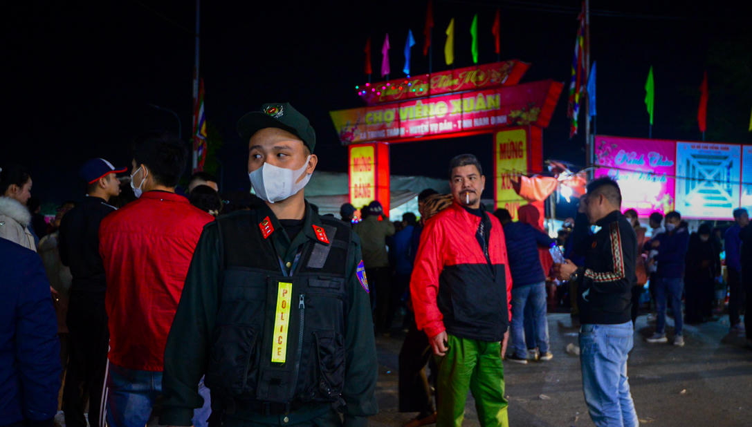 Lực lượng Công an tỉnh Nam Định có mặt từ đêm để đảm bảo giao thông cũng như tình hình an ninh trật tự tại Chợ Viềng.