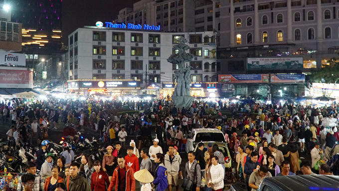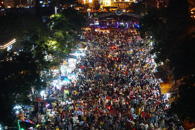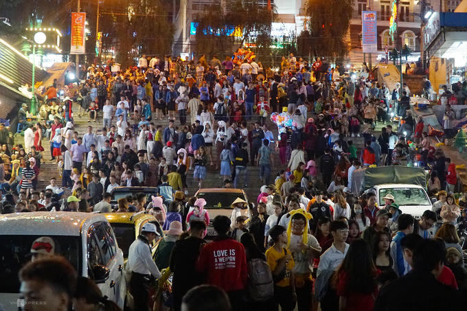 Hàng nghìn du khách đổ về trung tâm thành phố từ 18h và đông nghịt từ khoảng 20h ngày 28/4.