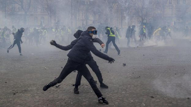 Cảnh sát đã sử dụng xịt hơi cay để giải tán những người biểu tình, lập các chướng ngại vật gần Đại lộ Champs Elysees. Những người biểu tình còn liên tục ném đá vào cảnh sát tại Đài tưởng niệm chiến tranh Arc de Triomphe, thậm chí tấn công một xe cảnh sát và tìm cách chui vào chiếc xe.