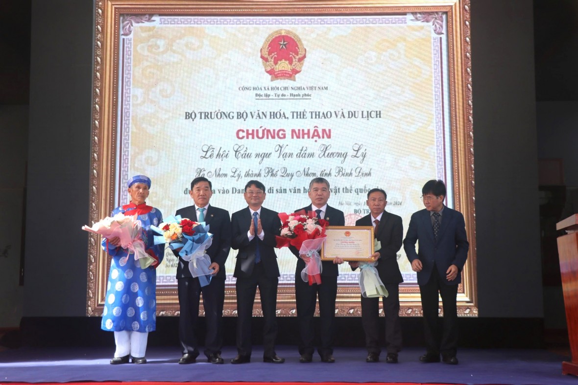 Tại buổi lễ, lãnh đạo Cục Di sản Văn hóa - Bộ Văn hóa, Thể thao và Du lịch đã trao Bằng chứng nhận di sản văn hóa phi vật thể quốc gia cho lãnh đạo thành phố Quy Nhơn dưới sự chứng kiến của đông đảo người dân và du khách.