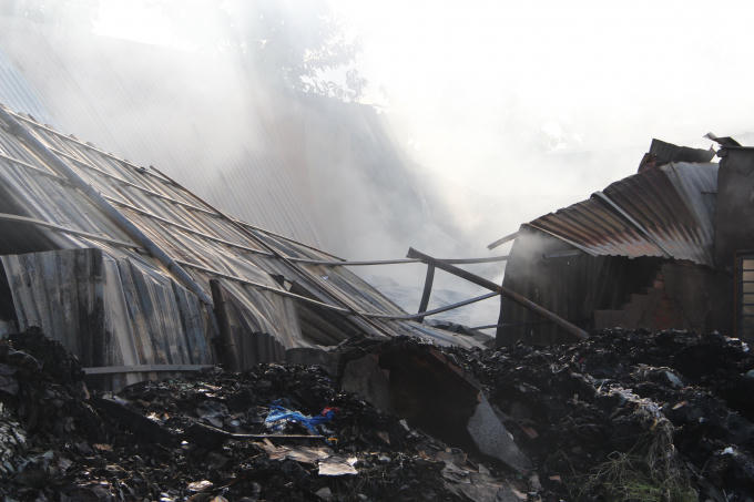 Ghi nhận phía trước 2 quán cà phê chòi lá bị thiêu rụi. Căn nhà khoảng 500m² mái tôn và một bên trường bị đổ sập. Trong căn nhà khói vẫn còn bay lên cùng mùi hóa chất nồng nặc.