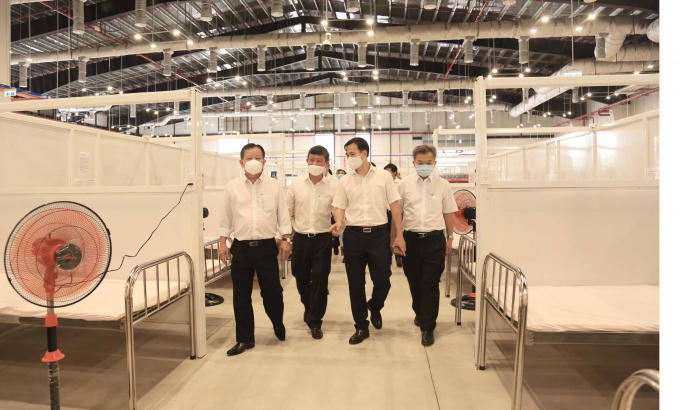 Lãnh đạo tỉnh Bình Dương và các cơ quan, ban, ngành đi kiểm tra bên trong bệnh viện dã chiến.