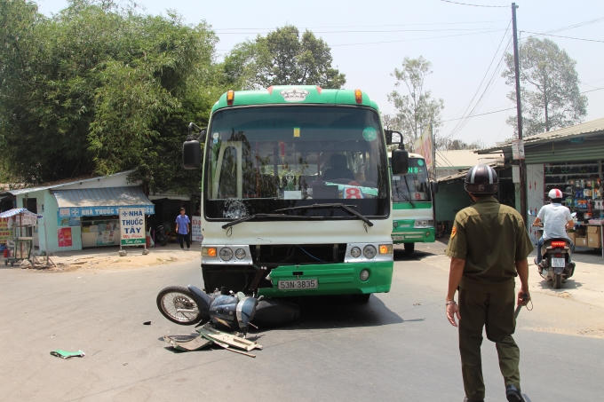 Tại hiện trường, chiếc xe máy nằm dưới gầm xe buýt bị hư hỏng nặng. Phần mui xe buýt bị bể nát, nhiều mảnh vỡ rơi ra đường.