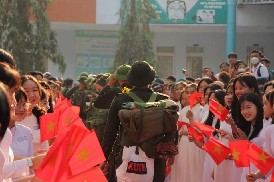 Tân binh hăng hái lên đường nhập ngũ.