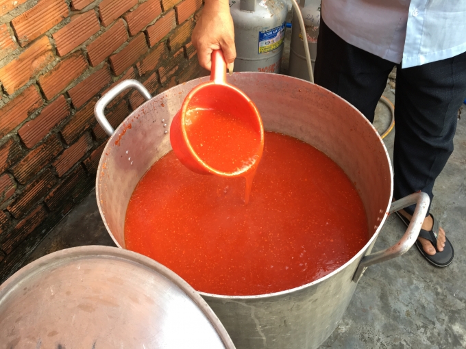 | Tương ớt được đựng trong các xoong để chuẩn bị đóng thành phẩm. |