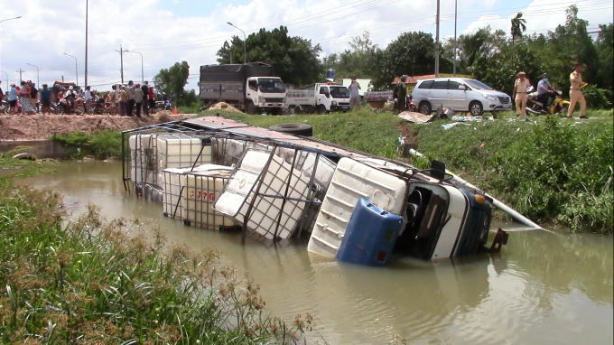 Sau cú tông cực mạnh, xe tải tiếp tục lao về phía trước tông vào đuôi xe tải mang BKS: 61C- 162.78 đang dừng đỗ bên đường khiến xe này rơi xuống mương nước bên đường tạo nên vụ tai nạn liên hoàn giữa ba phương tiện.