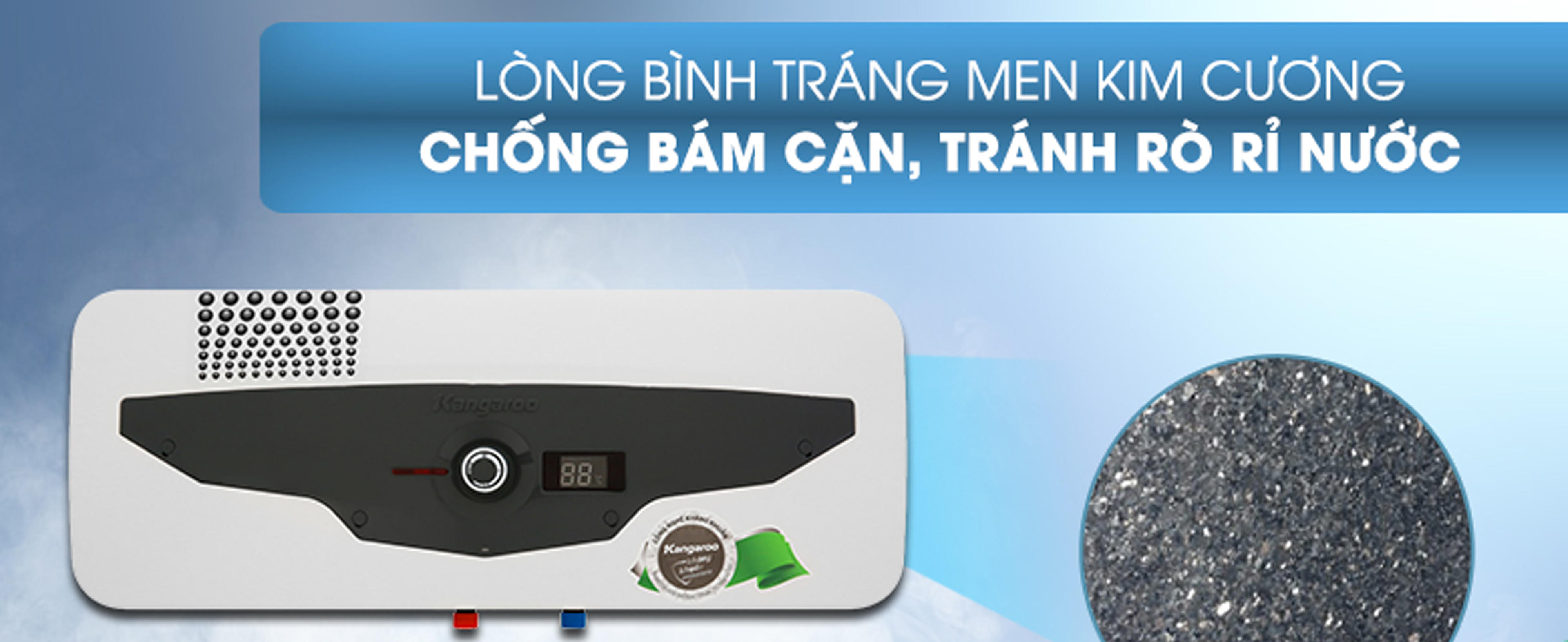 Nhờ lớp tráng kim cương nhân tạo này mà ruột bình không bị ăn mòn, độ bền gần như vĩnh cửu và an toàn tuyệt đối.Bình nóng lạnh Kangaroo có đường thoát nước cặn được thiết kế riêng biệt giúp công việc vệ sinh bình trở nên đơn giản hơn, kéo dài tuổi thọ bình chứa. Đặc biệt thích hợp với những nơi thiếu nước hoặc nước chất lượng nước kém.