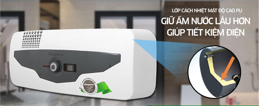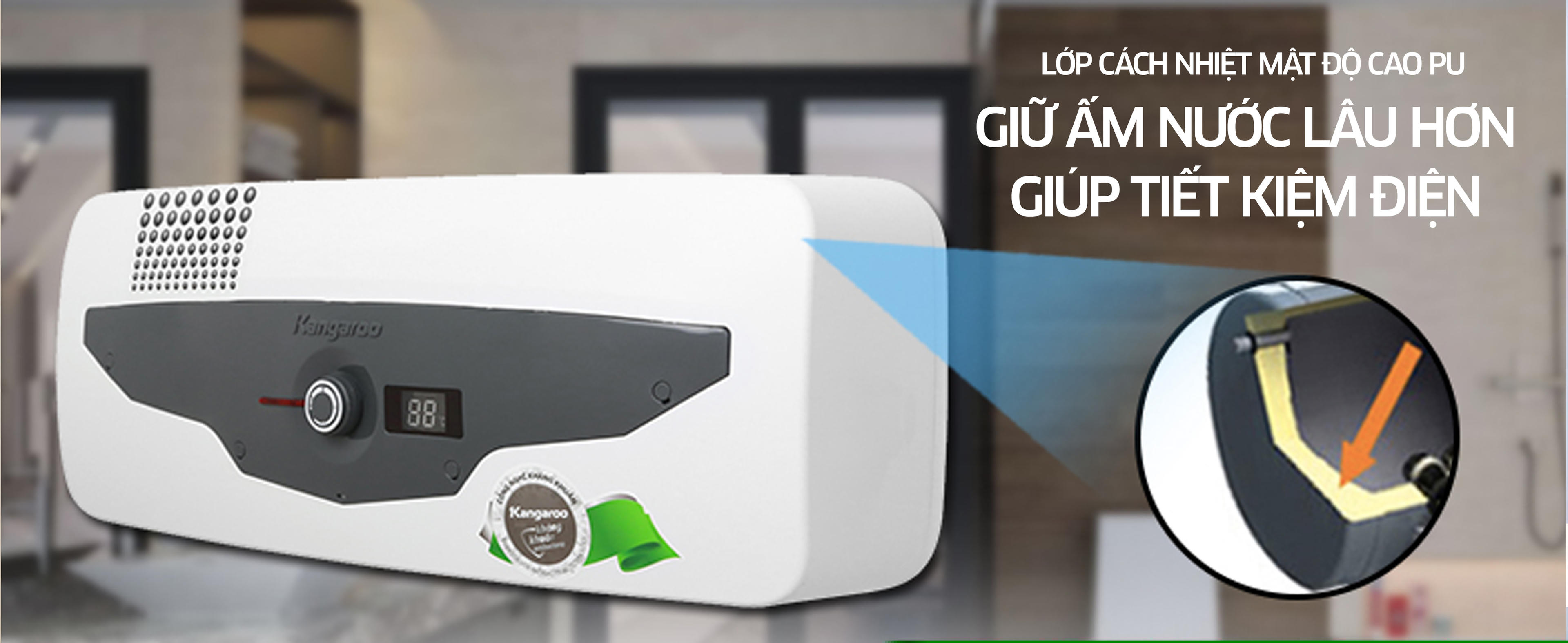 Bình nóng lạnh Kangaroo sử dụng thanh nhiệt mạ bạc không chỉ có tác dụng chống bám cặn mà còn có chức năng làm nóng nước nhanh chóng. Hơn nữa, công suất hoạt động của bình nước nóng lên tới 2.500W cũng đem đến hiệu quả làm nóng nước trong thời gian ngắn mà không tốn nhiều thời gian.Thông thường, bình nóng lạnh được thiết kế một lớp cách nhiệt ở giữa vỏ bình và ruột bình, giúp cho ruột bình không bị nguội đi nhanh chóng. Bình nước nóng của Kangaroo được trang bị lớp cách nhiệt PU mật độ cao được gia công với kỹ thuật tiên tiến, giúp tăng khả năng giữ nhiệt lâu dài hơn, tiết kiệm điện năng trong quá trình sử dụng.Với khả năng giữ nhiệt khá lâu, nếu trong bình nóng lạnh Kangaroo còn nước nóng từ tối hôm trước thì hôm sau bạn vẫn có nước nóng để dùng. Hoặc nếu chẳng may mất điện thì bạn vẫn có nước để dùng. Đây cũng là một ưu điểm của sản phẩm mà bạn nên quan tâm.